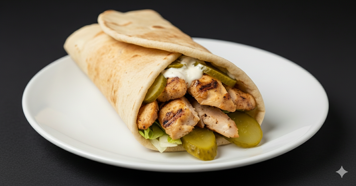 Marinated chicken, garlic sauce, pickles, wrapped in warm pita.
