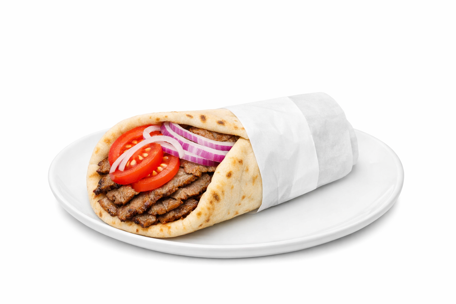 A freshly prepared halal gyro wrap filled with tender, seasoned meat, crisp vegetables, and creamy sauce wrapped in warm pita bread