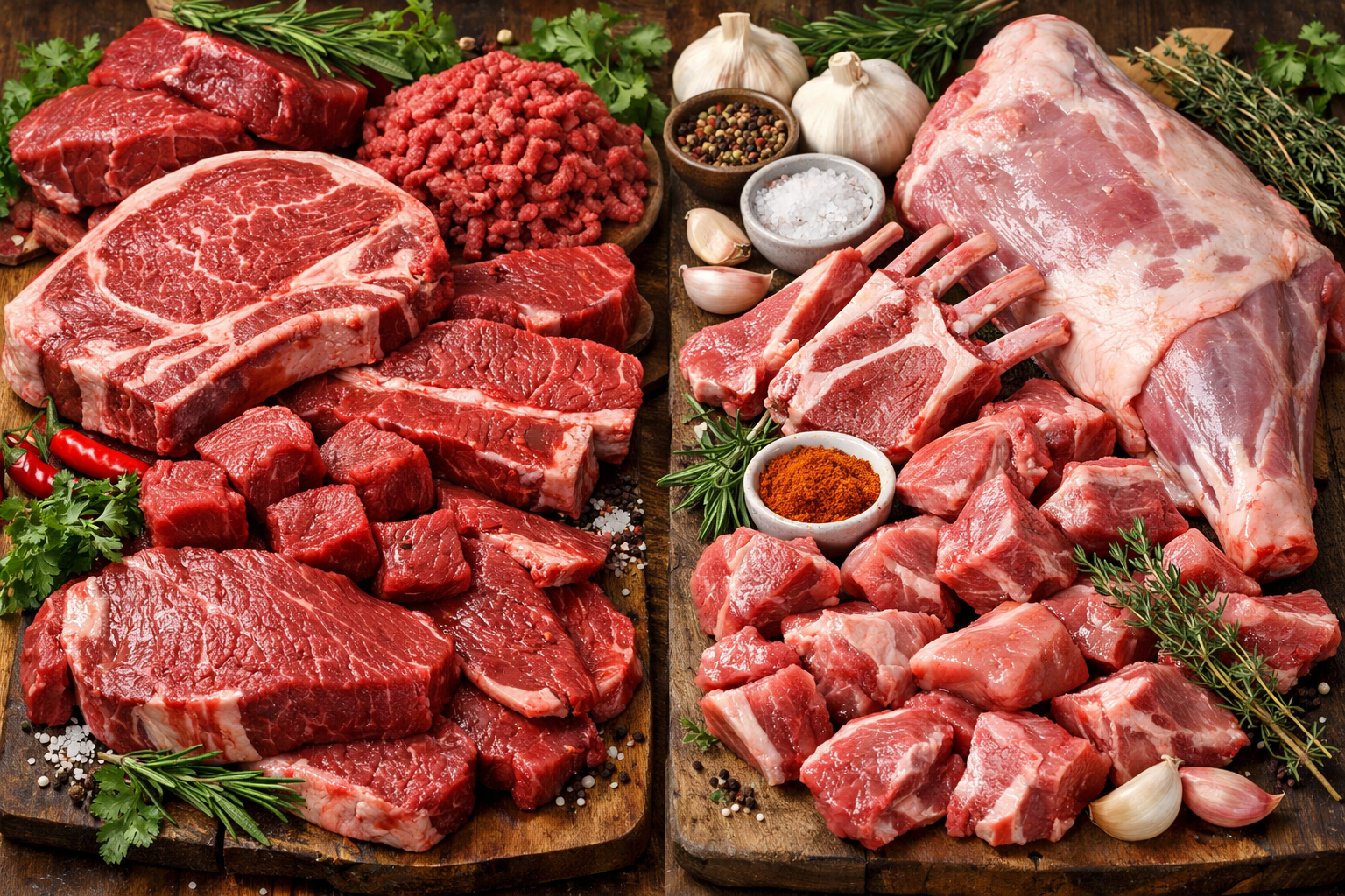 Discover the finest red meat cuts, featuring succulent beef and tender lamb/goat, perfect for grilling, roasting, or slow cooking. Our high-quality fresh meat selection includes ribeye steaks, cubes, minced beef, lamb chops, and whole cuts, all carefully trimmed and garnished with aromatic herbs and spices for ultimate flavor.